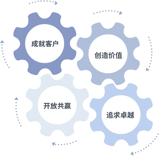 成就客户是一切决策的出发点,,,创造价值是衡量所有工作的标准,,,追求卓越是我们做事做人的态度,,开放共赢是我们的格局也是最终的结果。。。。价值观的齿轮环环相扣,,,,推动着组织里的每个人不断向前。。